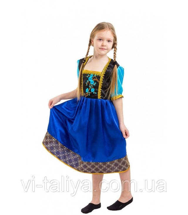Це вбрання підходить для дівчат віком від 6 до 9 років. До комплекту входить сукня, декоровані квіти та рюшами, а також накидка. Маскарадний костюмчик зроблений з кріпа-сатину.